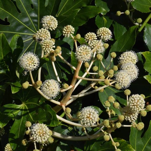Large evergreen shrub with architectural foliage, bearing panicles of white globular flowerheads in October. Good coastal plant. Any soil in sun or shade. Also grown as a houseplant where it will survive until it outgrows its position and can then be planted in the garden. Height 2-3m.