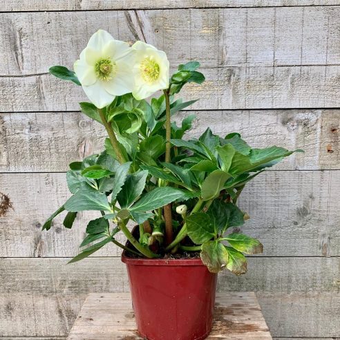 Christmas Rose. Large white, waxy flowers from December to March. Dark green, evergreen foliage. Moist, fertile soil in shade or part shade. Height 40cm. HARMFUL IF EATEN.