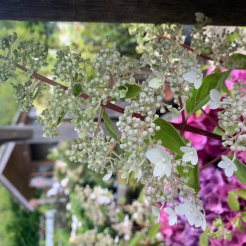 Deciduous shrub. Huge cone-shaped panicles of cream flower, ageing to soft pink. Late summer and autumn flowering. Prune every spring to keep vigorous growth. Any moist soil in semi-shade. Height 1½-2m.