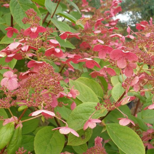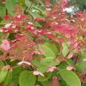 Deciduous shrub. Large white flowers from green buds, ageing to burgundy. Summer and autumn flowering. Prune every spring to keep vigorous growth. Any moist soil in sun or shade. Height 2m.