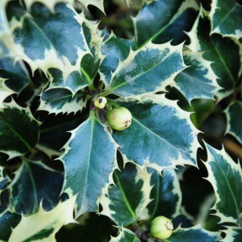 Female holly with creamy-white margined leaves. Any soil or situation including coastal & shade. Male pollinator needed. Height: 3-4 m
