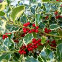 Holly. Evergreen shrub with silver variegation. A male variety which will pollinate any female. Good coastal plant. Any soil in sun or shade. Height 3m.