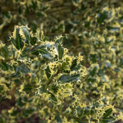 (Hedgehog Holly) A slow growing evergreen shrub with a double row of prickles. A good coastal plant. A male variety which will pollinate any female. Any soil in any site. Height 1-2m.