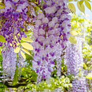 Early Dutch Honeysuckle. Large clusters of scented purple-red flowers, yellow inside, in May/June. Any soil in sun or part shade. Height: 5-7m.