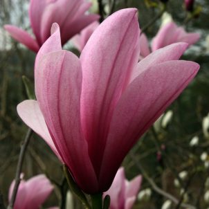 Single stemmed deciduous tree of upright habit. Very large flowers of deep red-purple. Some fragrance. Needs fertile, slightly acid soil. Height 6-10m.