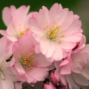 Flowering Crab Apple. Deciduous tree of weeping habit. Pale pink flowers open from crimson buds in May. Small red and yellow fruits in autumn. Any fertile soil sun or part shade. Height 6-10m.