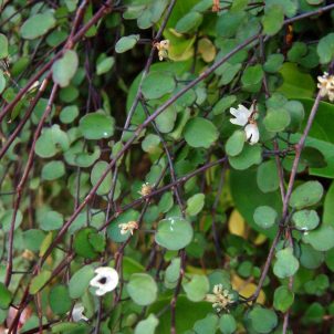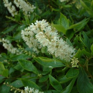 Decorative bamboo-like shrub with erect stems. Leaves are green, tinged purple-red in spring and summer. White flowers in terminal panicles in summer followed by red berries. Any well drained soil in full sun. Height 1½m. Best in sheltered position with little wind.