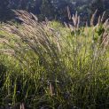 Oriental fountain grass. Makes clumps of fine grey-green leaves above which are carried fluffy white inflorescences over a very long period from early summer until autumn frost. Grow in well drained soil in full sun or light shade. Height 60cm.
