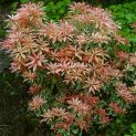 Small evergreen shrub. Beautiful silver variegated leaves. In spring the new growth is bright red. White flowers borne in drooping panicles in spring. Acid soil in sun or shade. Height 1-1½m.