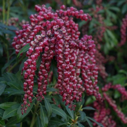Compact evergreen shrub. Panicles of deep cerise-pink pink flowers in drooping panicles in spring. A new variety bred for its vibrant flower colour. Moist acid soil only in semi-shade. Height 80cm.
