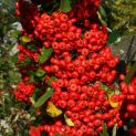 Firethorn. Evergreen shrub. When grown against a wall cut back long growths after flowering. White flowers in spring and glossy red berries in autumn. A new disease resistant variety. Fertile soil. Any aspect including shade and wind. Good coastal plant. Height 3m.