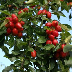 Evergreen Oak.The only non-coniferous tree to grow to a large size by the coast. Very salt and wind resistant. Juvenile leaves are prickly. Any soil in sun or shade. Can be clipped as a hedge or grown as a large specimen. Height 18-20m