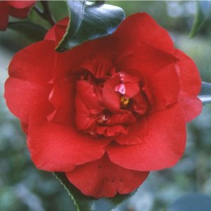 Evergreen shrub with flowers red in bud, opening large soft yellow with pink tones and a small red flare. May. Strong grower with handsome foliage. Moist acid soil in a sheltered shady position. Height 2-3m.