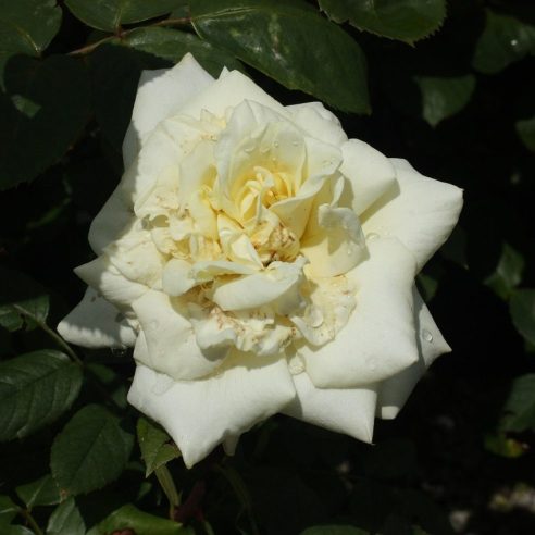 Hybrid Tea. White exhibition quality blooms over a long flowering season. Free flowering. Height and spread 100 x 80cm.
