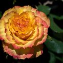 Hybrid Tea. An unusual colour combination. The yellow petals are edged red looking as if they have been dipped. Scented. Height 90cm.