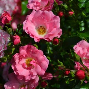 Rambler. 1950. A rampant rose for large buildings and trees. Huge trusses of scented creamy-white flowers with golden stamens in July. Height 10m.