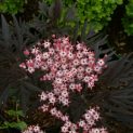 Elder. Deciduous shrub. Deep black-purple leaves in summer, then turning red in autumn. Very finely dissected foliage. A good coastal plant. Pale pink buds opening to flat white flowerheads in summer followed by black fruits. Any soil in any situation. Height 2-3m.