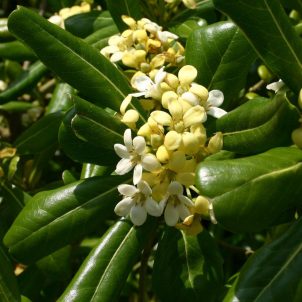 Compact evergreen shrub bearing large showy flower clusters in spring. Good coastal plant. Best in acid soil in sun or shade. A male variety. Height 1m.