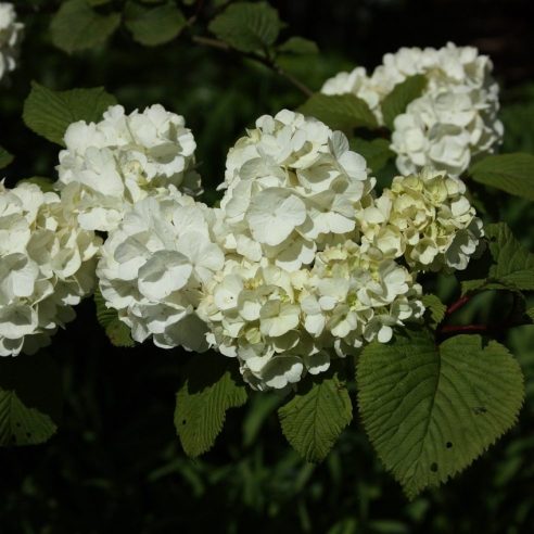 Strong growing deciduous shrub bearing large round clusters of white flowerheads in spring. Good autumn colour. Easy to grow. Any soil in sun or shade. Height and spread 3m.