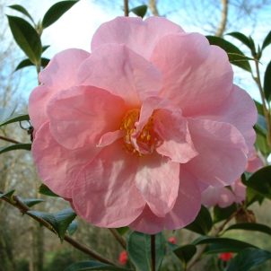 Evergreen shrub with larger leaf than the type. Red buds with white heads of flower in winter and spring. Good coastal plant. Easy to trim. Any soil in sun or part shade. Height 2-2½m in 10 years.
