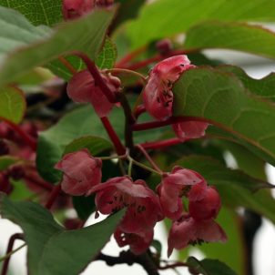 Purple leaved deciduous shrub. Pink tubular flowers in May and June. Prune out old wood after flowering to keep tidy. Any soil in sun or semi-shade. Height 2m.