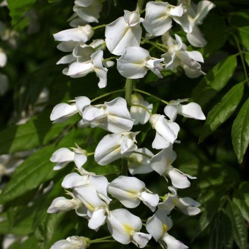 Long racemes of fragrant white flowers with a purple flush. Soft ferny foliage Tie in to cover walls/trellis. Once established cut laterals to 15cm in July and August. Shorten to two buds in December or January. Fertile soil in full sun. 6m-10m.