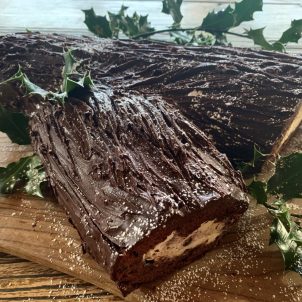 A light chocolate genoese sponge filled with freshly whipped cream and boozy dark cherries, finished with a dark rich chocolate ganache and traditional festive decoration.