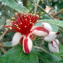 Pineapple Guava. Large evergreen shrub with grey-green leaves, white felted beneath. Fleshy crimson and white petals with long crimson central stamens. Edible fruits produced after a hot summer. Any soil in full sun and a sheltered position. Height 2-3m.