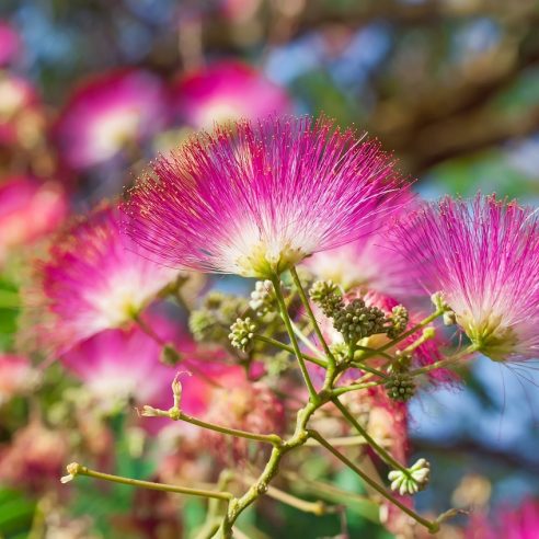 Graceful mimosa-like small spreading tree. Deciduous ferny foliage. Dense heads of hot pink fluffy flowers in late summer and autumn. Grow in full sun and well drained soil. In cold areas grow in the protection of a warm wall. Height 3m.