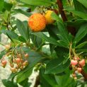 Strawberry tree. Small evergreen tree. Bark deep brown, shredding to reveal green beneath. White flowers and red fruit together late autumn. Sun. Good coastal tree. Lime tolerant. Height 3-4m