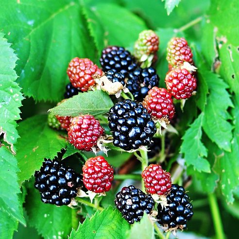 Completely thornless canes producing very heavy crops of large, jet black fruit. Exceptionally good flavour. Pick mid August/mid September. More compact than most varieties. Spread 5m.
