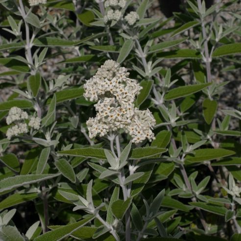('Morning Mist) Medium sized deciduous shrub with bright silvery fuzzy leaves. Creamy-white intensely fragrant flowers in late summer. Any good soil in full sun. Height: 2-3m.