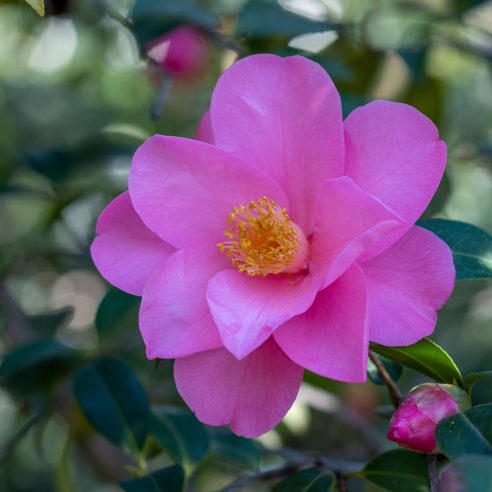 Large evergreen shrub of open habit. Rose-pink medium semi-double flowers. Very reliable. Best in acid soil in shade or semi-shade. Good coastal plant. Height 3m+.