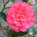 Large evergreen shrub. Upright compact habit. Flowers large dark red incomplete double. Outer petals waved, inner petals erect and fluted around central stamens. Needs a moist, well drained acid soil in shade or part shade. Height 2½m.