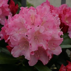 Large evergreen shrub. Medium sized semi-double flowers, pink with a white margin. Needs acid soil and some shade. Good coastal plant. Height 3m.