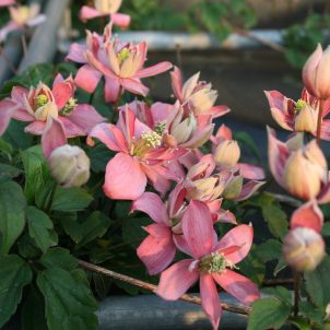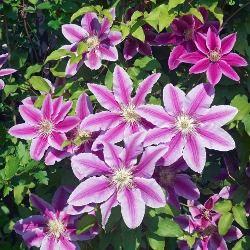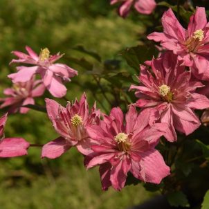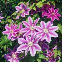 Blue-mauve with a red bar. May/June + Sept. Aspect: Any except South. Height: 2½m-3m. Prune to strong buds on last years wood Rich fertile soil. Shade roots from sun.
