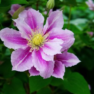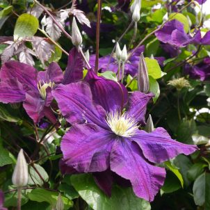 Deep wine-red flowers with a paler bar from May to September. Aspect: Any. Height: 2m.Prune to strong buds on last year's wood. Rich fertile soil. Shade roots from sun.