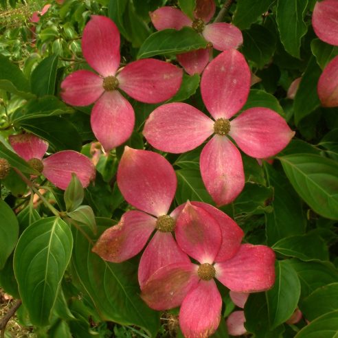 Beautiful small deciduous tree. Creamy-white flower bracts which open in June and gradually turn deep pink. Strawberry-like fruits in autumn. Any soil in any situation. Height 3-4m.