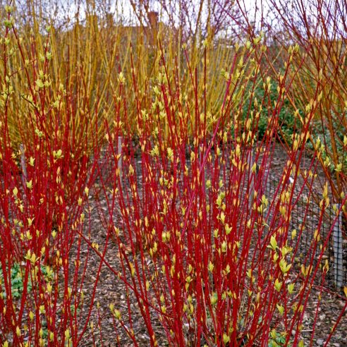 Dogwood. Deciduous shrub grown mostly for brilliant winter stem colour. Hard prune every 2 years. Best in good moist soils in sun or shade. Height 1m.