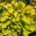 Smoke Tree. Stunning yellow leaved form. Deciduous. To keep bushy and reduce size prune in early spring. Large pink flower clusters on larger plants in summer. Any soil any site. Height 2m.