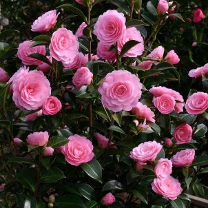 Graceful semi-evergreen shrub. White flowers in spring and orange-red fruits in autumn. Good coastal plant. Any soil in sun or shade. Height 2m.