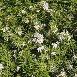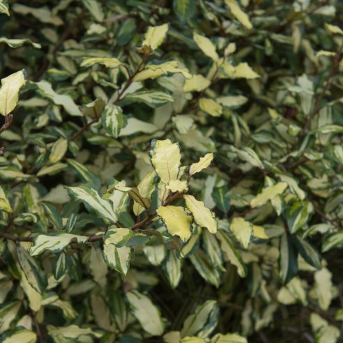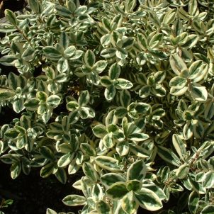 Slow growing cream and green variegated evergreen. Small highly scented flowers in autumn. Good coastal plant. Any fertile soil except shallow chalk, in sun or semi-shade. Height 1-2m.