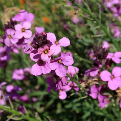 Shrubby Wallflower. Clusters of scented mauve flowers from late winter to early summer. 60cm. Shrubby habit with grey-green foliage. Best in poorish, well drained soil, in full sun. Trim after flowering to keep compact.