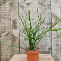 Commonly called, 'Pencil cactus' is a member of the euphorbia family. Place in a well- lit position with sun and allow compost to dry in between waterings. As with other cactus care must be taken not to overwater. Keep dry in winter and protect from frost. Pot on when potbound using a cactus compost. Sap can irritate skin. Min Temp 10C.
