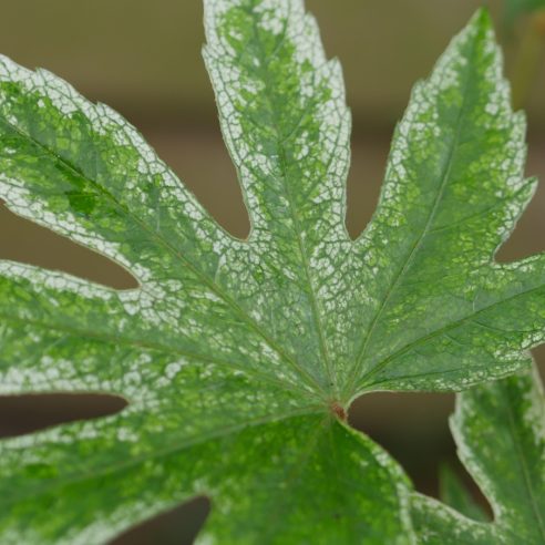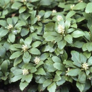 Compact form of this popular evergreen architectural shrub. White mottled foliage. Compound heads of white globular flower from October to January, followed by black berries. Good coastal plant. Any soil in sun or shade. Height 1½m.