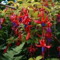 Vigorous hardy fuchsia. Golden foliage. Sepals cerise. Corolla violet. Single flowers. Also good coastal plant. Any moist soil in sun or shade. Height 90cm.