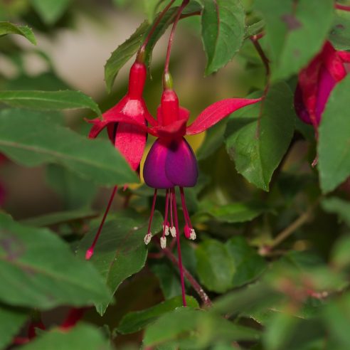 Vigorous hardy shrub. Sepals scarlet. Corolla purple-violet, veined cerise. Large single flowers. Also good coastal plant. Any soil in sun or shade. Height 1.2m.