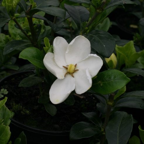 Hardy Gardenia. Low growing evergreen shrub. Star-like white flowers with an intense fragrance. Most profuse in early summer but flowers 5 through the rest of the summer. Best in a moist well-drained soil in full sun to light shade. Ideal for pots or where the perfume can be appreciated. Height and spread 90cm.