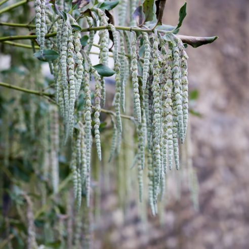 Evergreen shrub best grown against a wall for protection. Extra long catkins. Best in well drained soil in sun or shade. Good coastal plant. Height 2-3m.