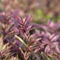 Striking dwarf Hebe in the Magic series. Leaves become purple red in winter and spring, white variegated in summer. Good coastal plant. Any well drained soil in full sun, best with some shelter (not lower than -5C). Blue flowers in summer.Light trim only. Height 60cm.